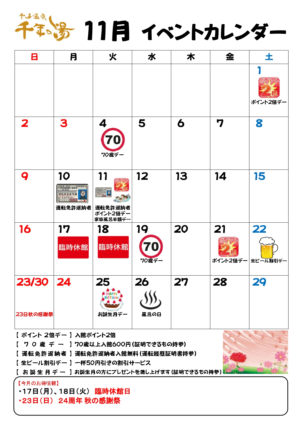 【11月イベントカレンダー】 2025年11月04日 お知らせ 【臨時休館のお知らせ】 11月17日(月)18日(火) の2日間、定期メンテナンスの為、臨時休館とさせて頂きます ご不便をお掛け致しますが、ご理解とご協力をお願い致します なお、19日(水)より通常営業となります。 【秋の感謝祭のお知らせ】 11月23日(日) 千年の湯にて24周年秋の感謝祭を開催致します 今年も屋外、屋内でのイベントやキッチンカーなど、さまざまな企画やお得が盛りだくさんです ぜひお楽しみに たくさんの皆様のご来館をスタッフ一同お待ちしております
