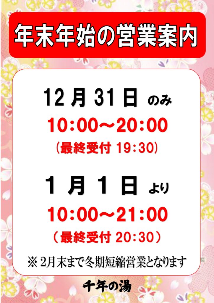 いつも千年の湯をご利用頂き誠にありがとうございます。