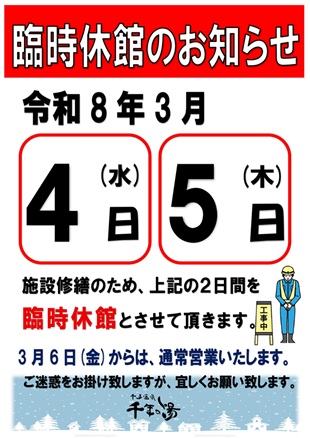降雪による施設破損部修繕の為、臨時休館とさせて頂きます。