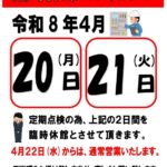 いつも千手温泉千年の湯をご利用いただき誠にありがとうございます。 誠に勝手ながら4月20日(月)21日(火)の […]